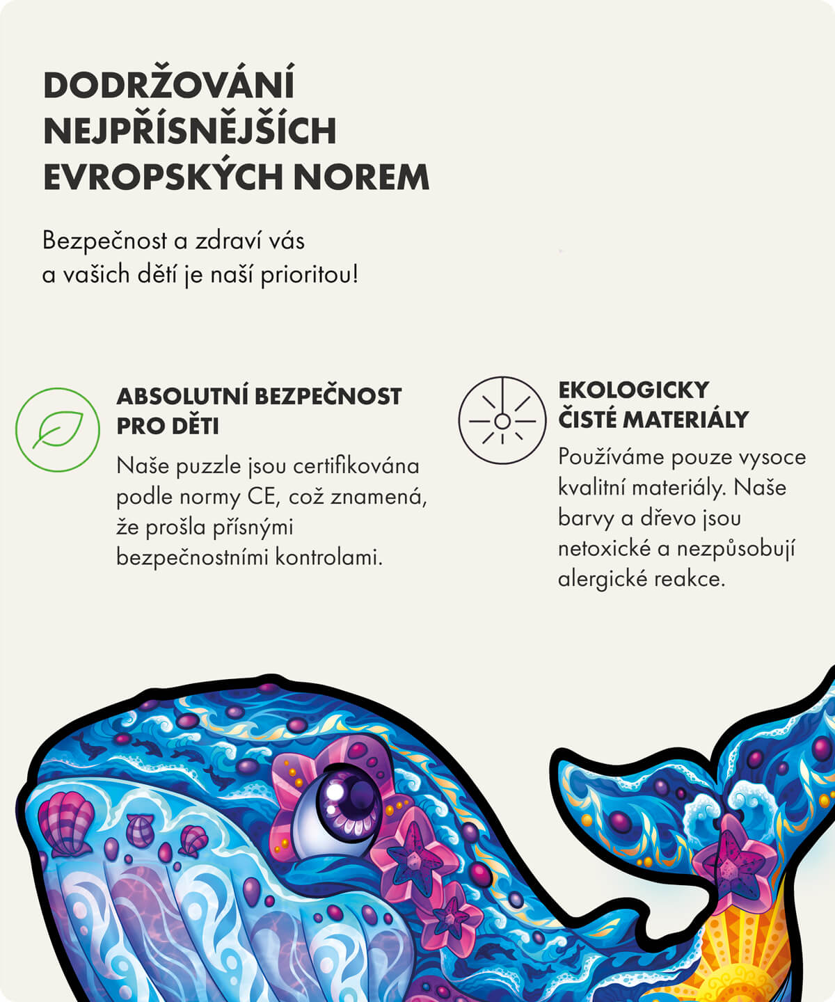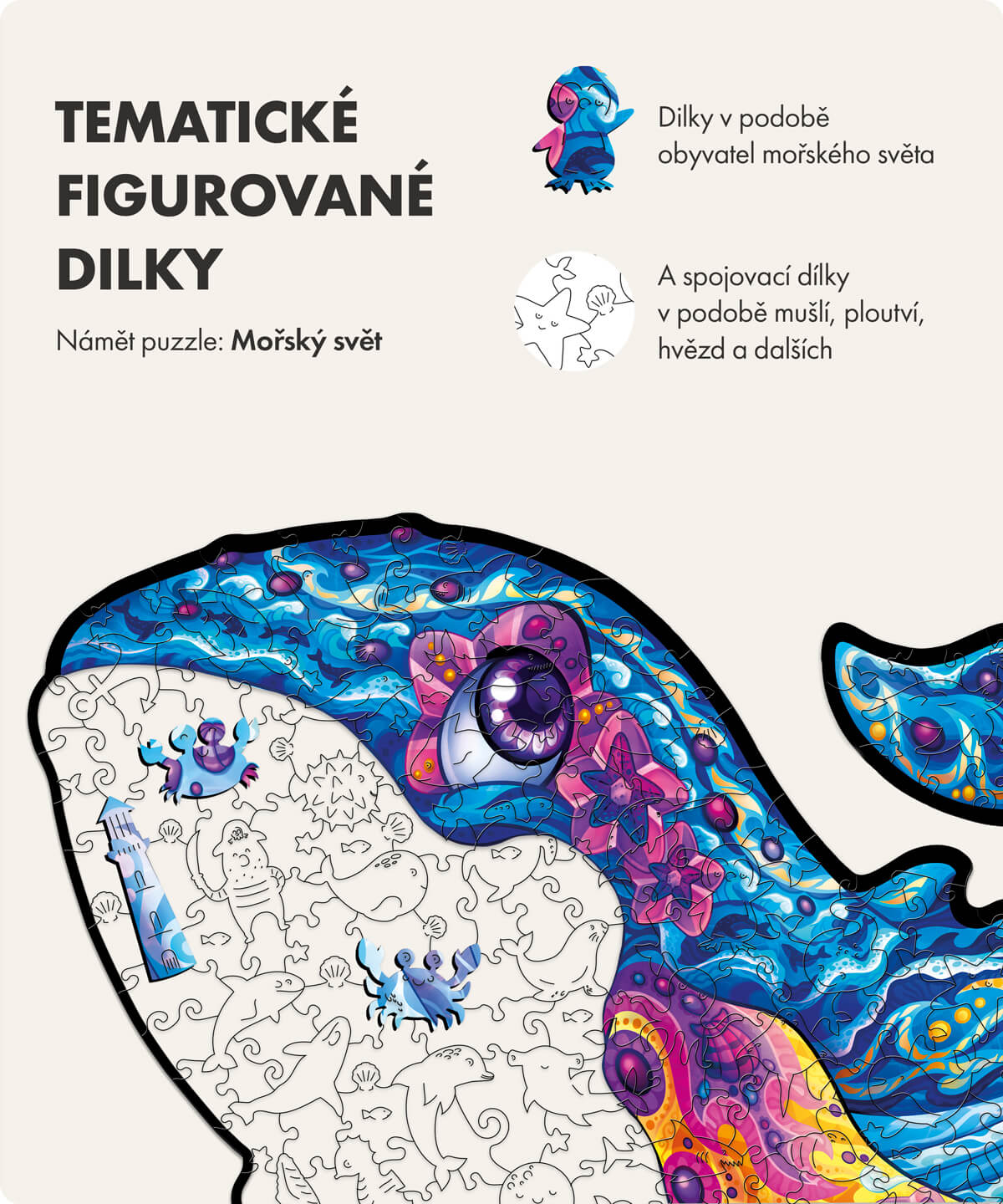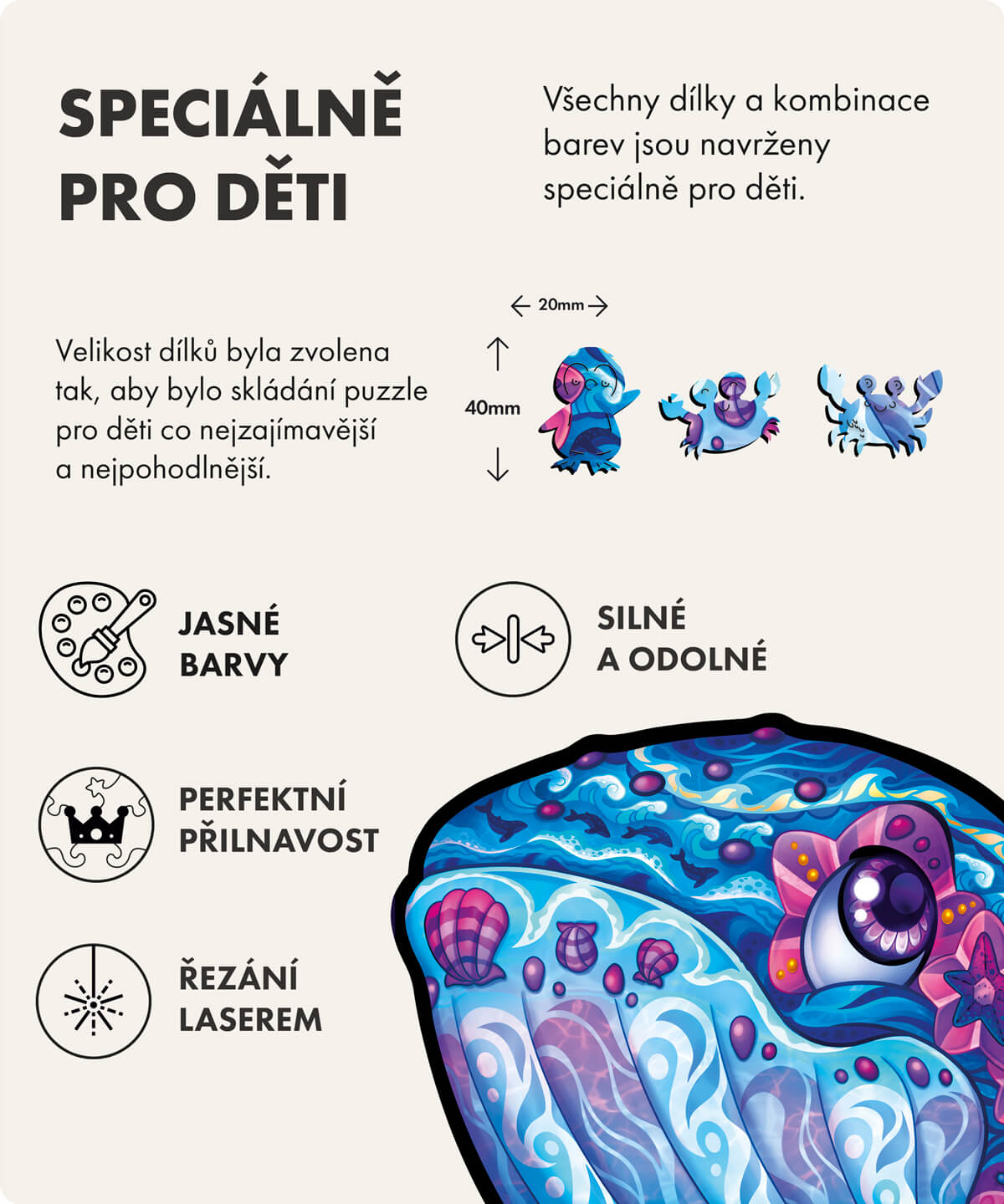 Tajomstvo hlbokého oceánu sú drevené puzzle, ktoré sa skladajú zo 100 dielikov a sú vhodné pre deti od 7 - 99 rokov. Jednotlivé dieliky majú rôzne tvary morského sveta.