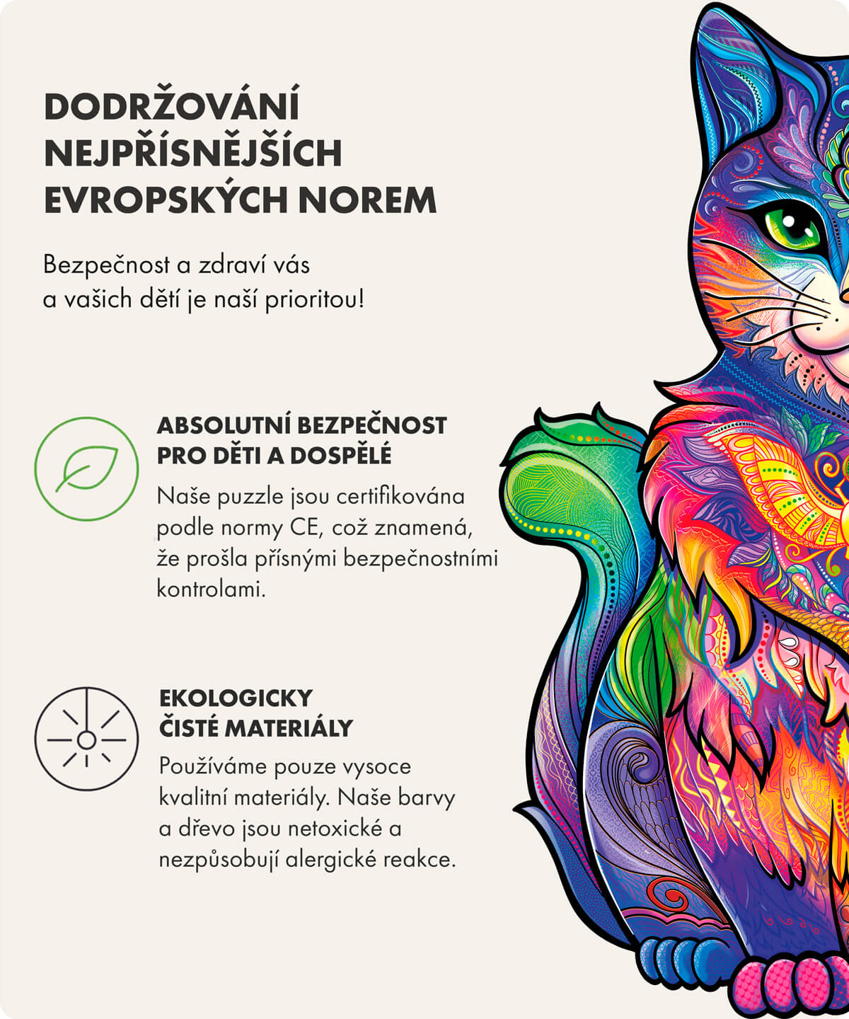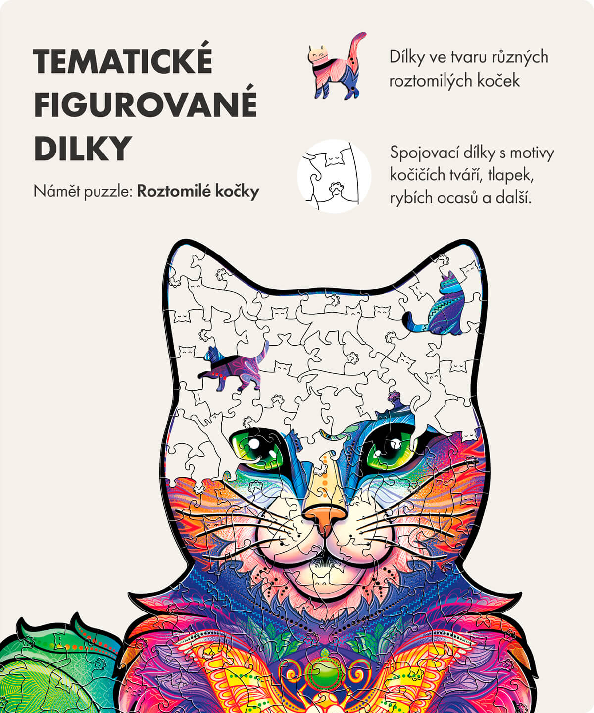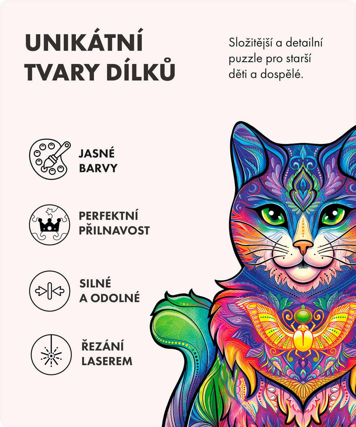Mačacia bohyňa staroveku sú drevené puzzle, ktoré sa skladajú zo 160 dielikov a sú vhodné pre deti od 14-99 rokov. Jednotlivé dieliky majú rôzne tvary plemien mačiek..